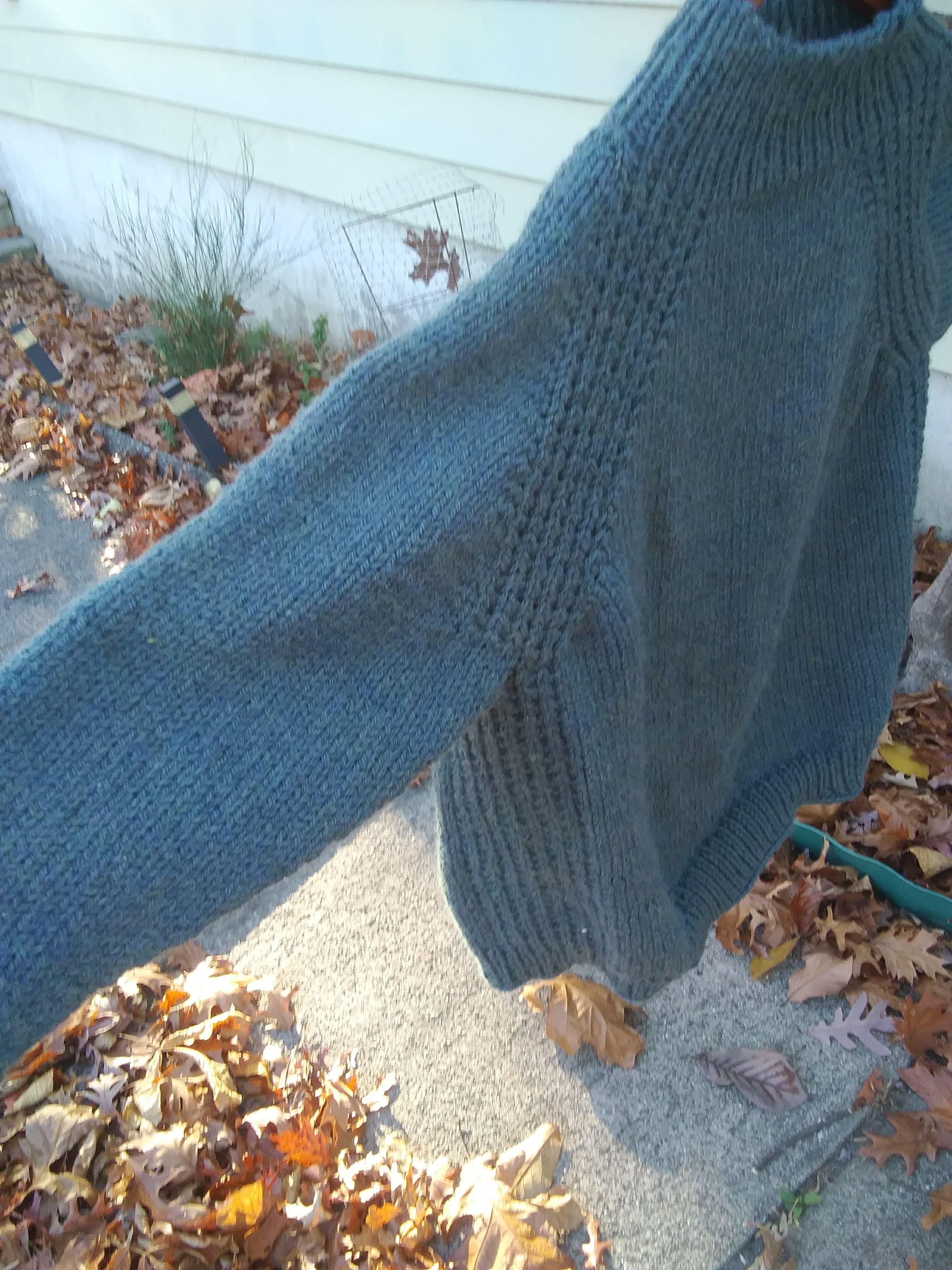 Knitting, cross-stitch, petting cats.....my usual scope of hobbies continues. This odd photo is the Syli Sweater. A gigantic top-down raglan with textural details. I promptly sold it too!! After many months (years!) trying to sell my crafty items, I've found a niche market for my knitwear. By "niche' I mean my bestie in Virginia buys 90% of the stuff I knit as gifts and for herself and her daughter. I think this biggie is destined for her future son-in-law.